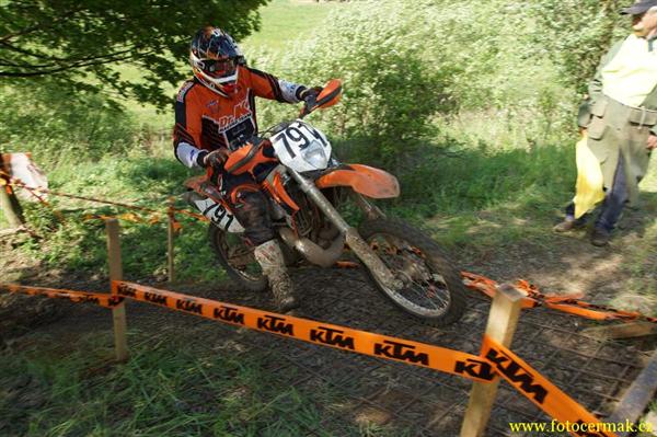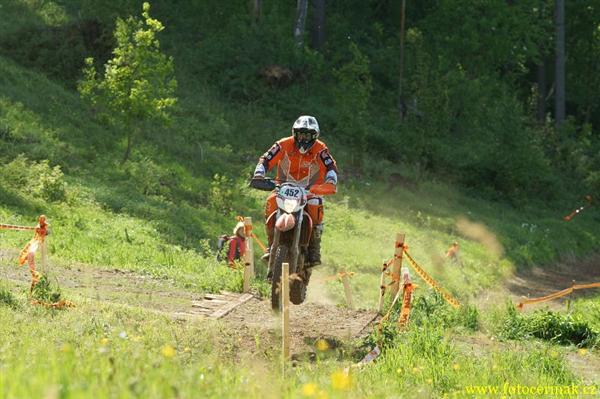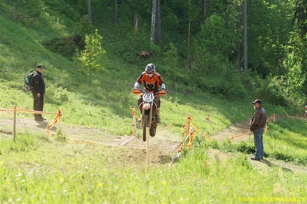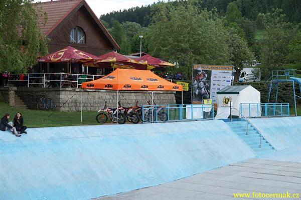 Následuje start hobíků. Je stále ještě kluzko a než se trať vyjede, tak to chvíli trvá. Zato licence a veteráni startují do vyjeté tratě a jede se jim o poznání lépe. Trať je parádní a kamenitý sjezd dává jezdcům pořádně zabrat. Je se opravdu na co koukat. Parádní svezení.Večer praská kiosek na koupališti ve švech a všichni jezdci včetně diváků doplňují tekutiny. Doplňujeme také:-)
